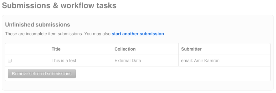 Now you should be on the main Submission and Workflow tasks page where you can view your incomplete/archive submissions. Click on the 'Start another submission' link to start a new Submission.